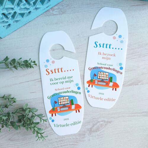 Leuke deurhanger met tekst ‘Ssttt… ik bezoek mijn School voor Gemeenteouderlingen’ en aan de andere zijde ‘Ssttt… Ik bereid me voor op mijn School voor Gemeenteouderlingen’. Gemaakt van stevige, glanzende foto papier. Leuk icm andere ouderlingenschool artikelen.