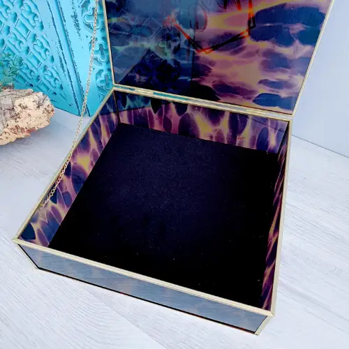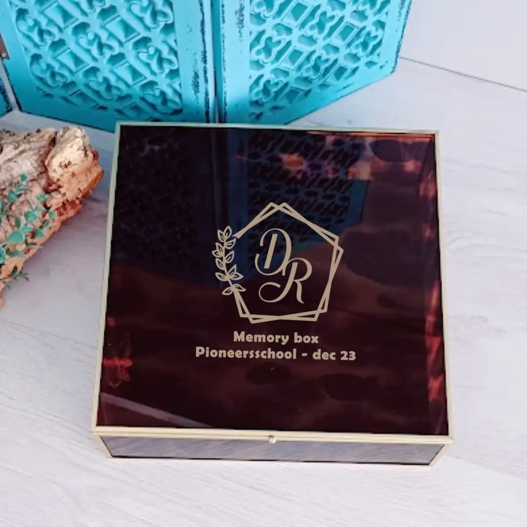 De doos is gemaakt van een goudkleurige frame en bruine glas en een fluwelen bodem. Het is 28 bij 28 cm en 8 cm hoog. Het bevat een mooie goudkleurige ketting om het open te houden. Aan de bovenkant, is de doos voorzien van de initialen van de leerling en kan zelf de klas nr worden voorzien.