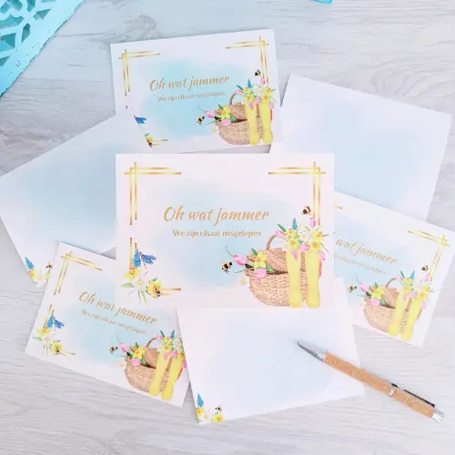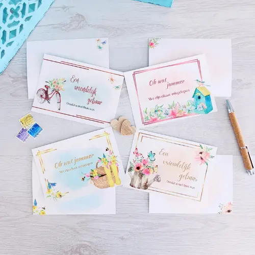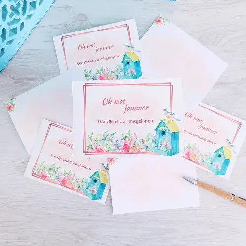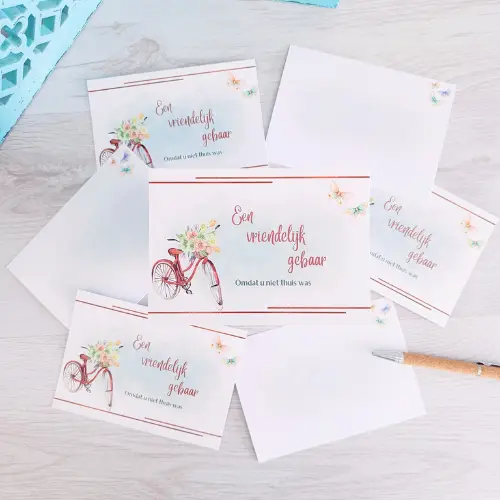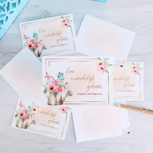 Laat eens een kaartje achter. En dan niet zomaar een kaartje, maar een kaartje dat aangeeft dat we elkaar zijn misgelopen. Deze kaarten set bestaat uit 4 verschillende kaarten met de tekst “Een vriendelijk gebaar … Omdat u niet thuis was” en “Oh wat jammer … We elkaar zijn misgelopen”. Altijd fijn om iemand te laten weten dat u langs bent geweest. haal een set voor uzelf of geef een setje mee in een cadeau box.